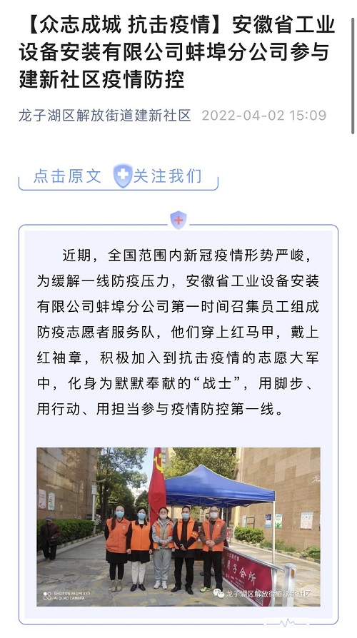 “疫情就是命令,防控就是責任”。近期,國內省內新冠疫情呈多點發生、局部暴發的態勢,疫情防控形勢嚴峻。為有效防止疫情傳播蔓延,緩解一線防疫壓力,蚌埠分公司黨支部積極號召黨員干部、團員青年組成志愿者服務隊深入蚌埠市龍子湖區解放街道建新社區開展為期一周的疫情防控志愿者服務活動。