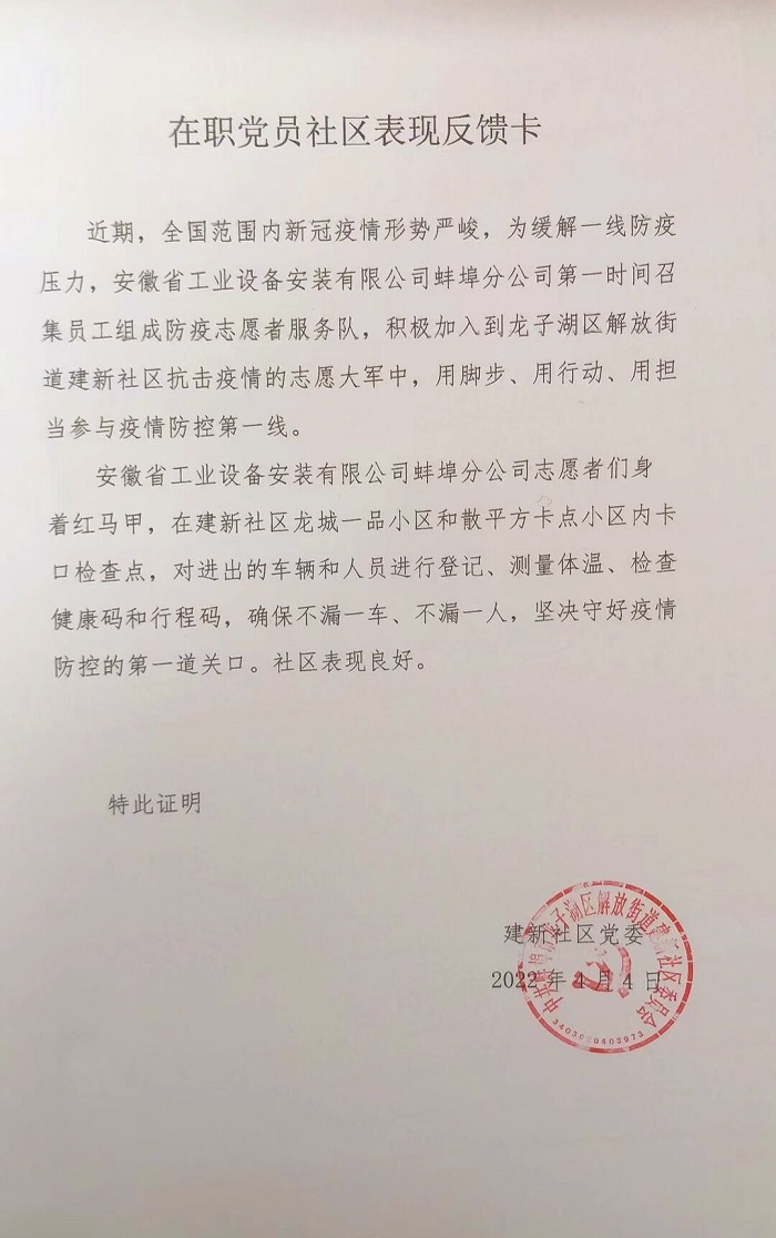 通過本次活動,志愿者們用實際行動踐行了初心和使命,展現了安徽安裝志愿者飽滿的精神風貌。建新社區黨委表達了對于安徽安裝公司的真誠感謝,期間社區及時通過微信公眾號對安徽安裝積極擔當社會責任予以報道,有效擴大了企業影響力,樹立了良好企業形象。