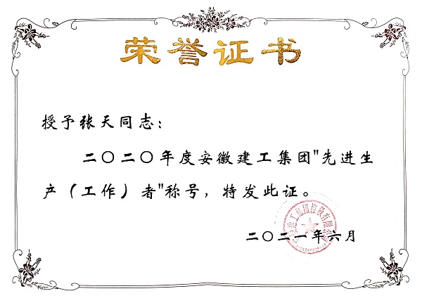 2017年5月,張天同志根據工作需要遠赴新疆烏蘇項目上,在不到兩年的時間內,嚴謹求實,勤奮刻苦,兢兢業業,時時處處嚴格要求自己,始終以飽滿的工作熱情、扎實的工作作風、優異的工作成績,贏得了廣大員工的普遍好評,榮獲2020年“建工集團年度先進生產(工作)者”稱號。