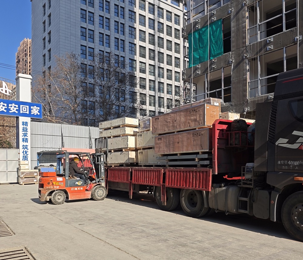 分公司商機廠租賃住房項目電梯到貨,現場施工人員正在準備卸貨