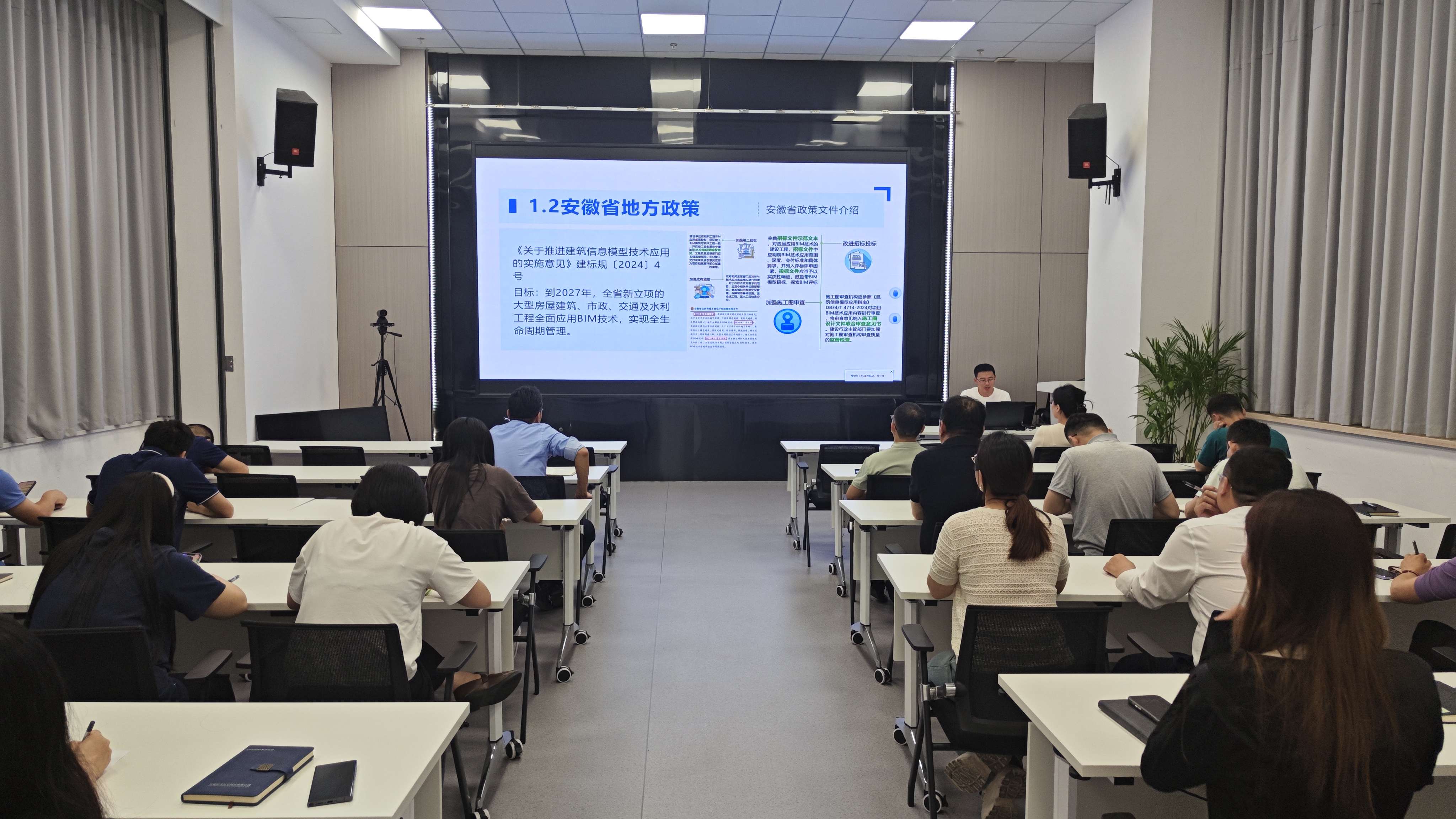 主講人圍繞BIM技術(shù)展開系統(tǒng)講解。梳理國家及安徽省BIM政策要點(diǎn),深度闡釋BIM技術(shù)概念與原理,著重解析其應(yīng)用價(jià)值與優(yōu)勢。隨后詳細(xì)說明BIM工作流程以及核心技術(shù)應(yīng)用點(diǎn),并借助三個視頻短片直觀呈現(xiàn)實(shí)際應(yīng)用場景,助力參訓(xùn)人員深化對BIM技術(shù)的理解。
