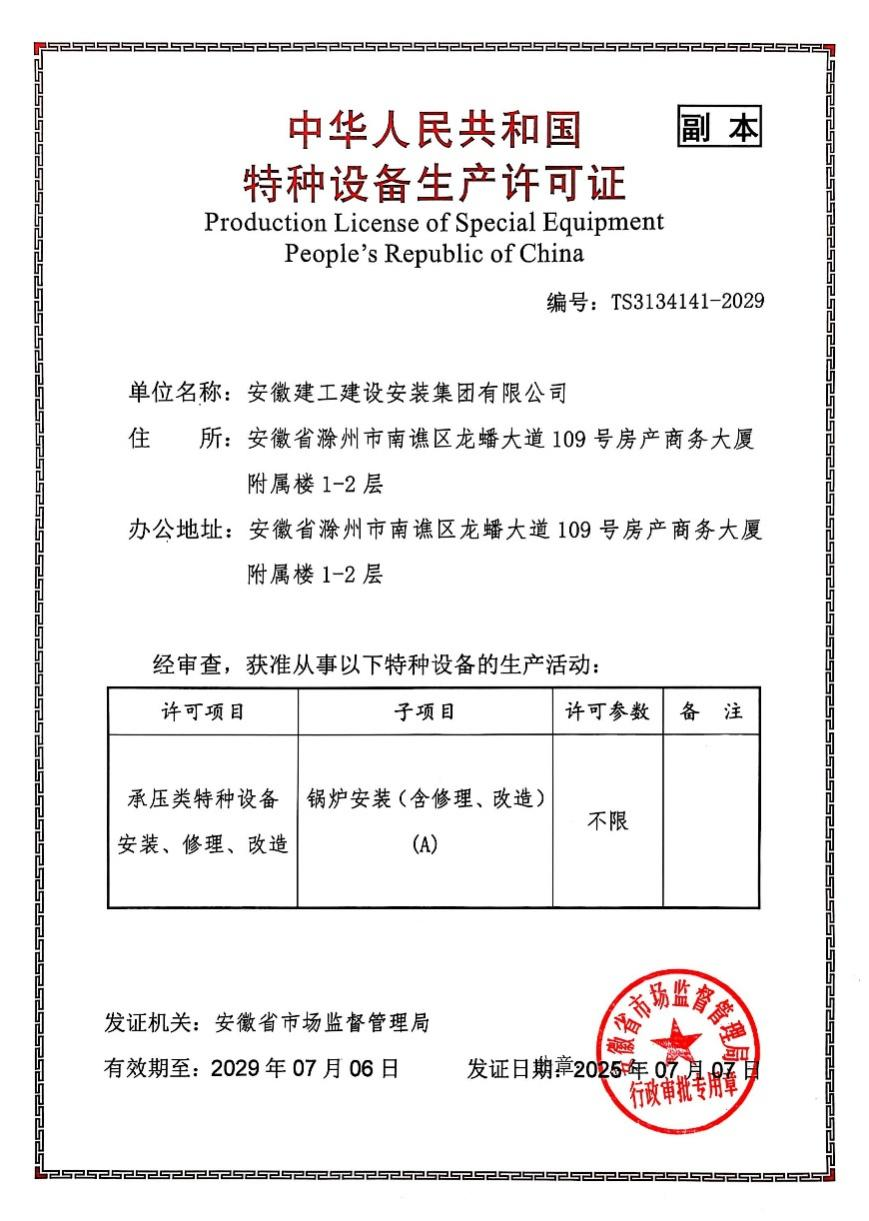 建工安裝順利取得鍋爐特種設(shè)備許可A級證書