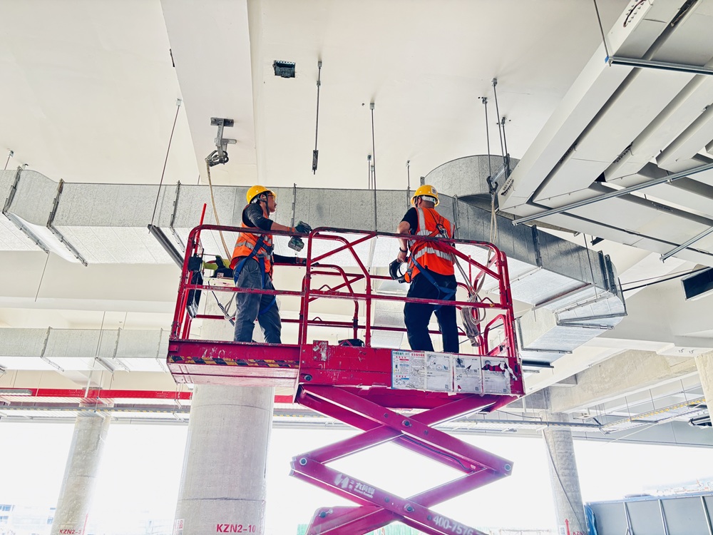 航站樓空間結構復雜,需多專業立體交叉作業,項目部科學優化施工組織,打出項目管理“組合拳”。全面推行周計劃進度管控機制,將龐大建設任務分解細化為周目標,確保節點任務高效推進;深度運用BIM技術開展碰撞檢查,實現風管、水管、橋架等管線精準排布;關鍵區域實施24小時輪班作業,人停機不停與時間賽跑。一系列舉措成效顯著,截至目前,機電主管線安裝已完成超過30%,南北指廊S2、S3區與N2、N3區的空調機房、熱力交換站設備已就位,機電主管線正全力推進安裝,為后續設備安裝調試贏得了寶貴時間。